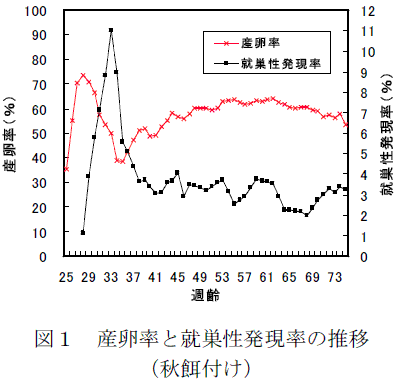 秋餌付けの鶏群では、産卵のピークの28週齢から就巣性の発現がみられ、その1ヶ月後の33週齢に就巣性発現率が最も高くなり、38週齢以降は2~4%の範囲で推移する(図1)。 |
