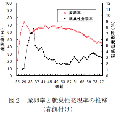 春餌付けの鶏群では、産卵のピーク直前の28週齢から就巣性の発現がみられ、産卵率ピーク(29週齢)の1ヶ月後の35週齢に就巣性発現率が最も高くなり、41週齢以降は2~4%の範囲で推移する(図2)。 |