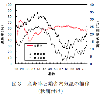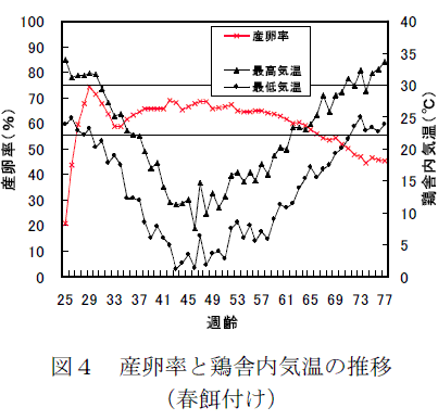 鶏舎内の最低気温が23℃、最高気温が30℃を越えると、暑熱ストレスによる産卵率の低下が顕著にみられる(図3、4)。 |