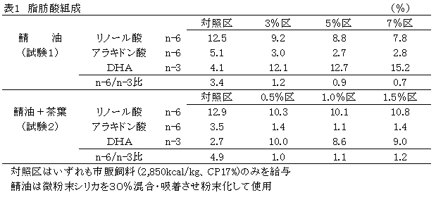 採卵鶏飼料に鯖油を添加給与することにより、卵黄中のドコサヘキサエン酸(DHA)含量が増加しアラキドン酸含量が減少して、n-6/n-3比の低い鶏卵が生産できる。 | ||||||||||