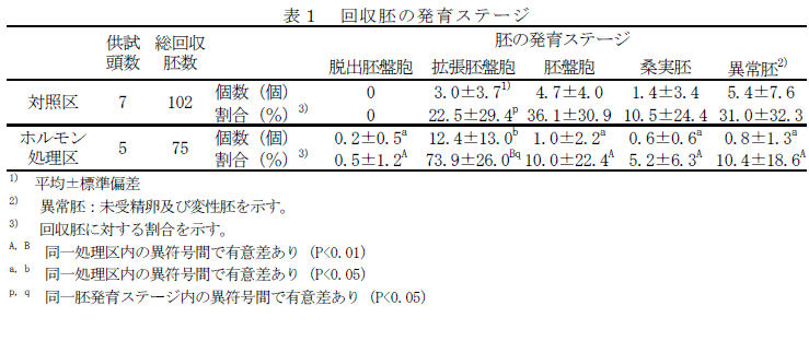 PMSGとhCGの投与は、春機発動前の豚に対して発情誘起及び排卵の斉一化を目的に利用されているが、春機発動後の豚に対してはPMSGとhCGのみの投与では、本試験のような胚発育ステージの斉一化の効果は得られない。 |