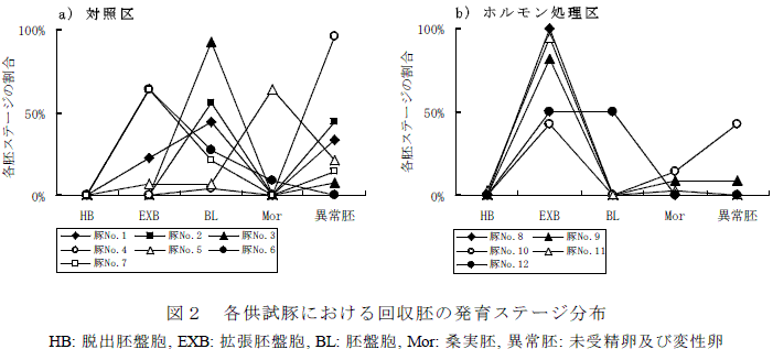 各供試豚毎に回収胚ステージを比較すると、対照区(自然発情)では個体によって回収される胚ステージが様々である。また、各個体内においても比較的広い範囲のステージの胚が回収される。(図2) |