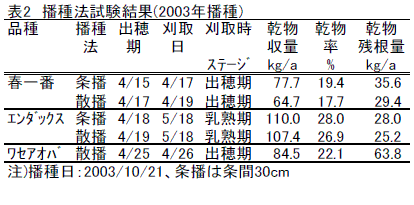 飼料イネでは直播のホシアオバが、飼料用麦類ではエンダックスが最も多収となったが、飼料用麦類では、10月が多雨となる年(2004年)には発芽時の湿害により収量が低下するおそれがあるため、排水対策が必要である。また、飼料イネは直播することにより育苗に係るコストを削減できる。 |