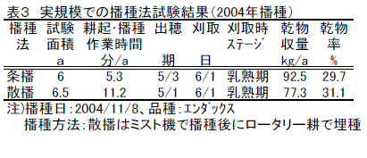 飼料用麦類の播種方法は、散播(ミスト機を使用して播種)と比較して条播(ロータリーシーダーを使用して播種)の方が、同時に耕起、施肥、播種を行うため省力的であり、収量性の点からも優れている(表3)。 |