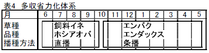以上のことから、飼料イネ・飼料用麦類の1年2毛作体系は、飼料イネはホシアオバを直播で、飼料用麦類はエンバクのエンダックスを条播する栽培体系が最も多収であり省力である(表4)。 |