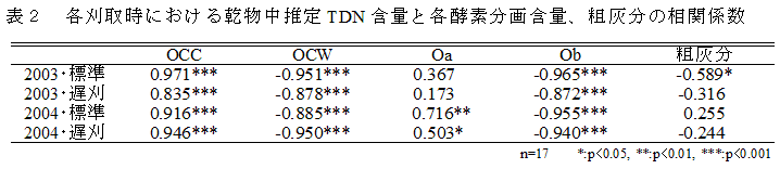 刈取時、年次を問わず、推定TDN含量とOCC、OCW、Ob含量との間の相関は高く、Oa含量、粗灰分との間のそれは低い(表2)。 |