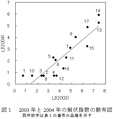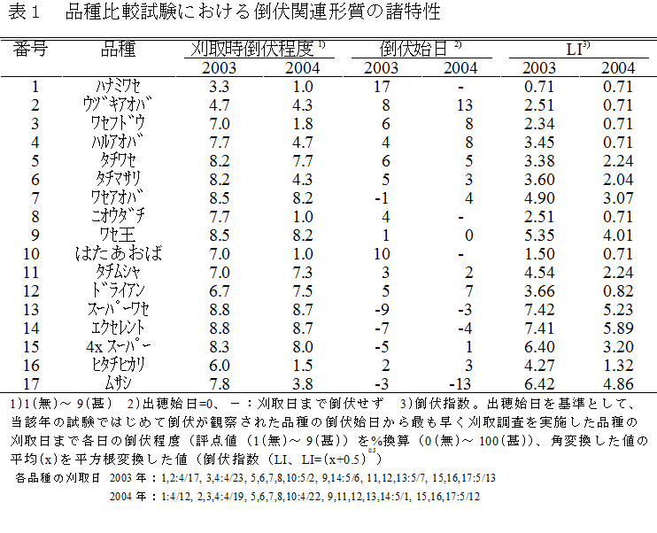 出穂始日を基準として、当該試験ではじめて倒伏が観察された日から最も早く刈取調査を実施した品種の刈取日までの各日の倒伏程度の角変換値の平均の平方根変換値(倒伏指数(LI))により品種の耐倒伏性程度を的確に把握できる。 | ||||||