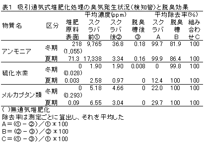 堆肥原料表面から揮散するアンモニアは、平均218ppmと無通気堆肥化(1,055ppm)の約1/5に低減され、硫化水素、メルカプタン類も低減される(表1)。 |