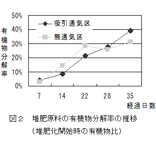 鶏ふんにもみ殻を副資材として混合した堆肥原料(重量約5t,水分59%,容積重660kg/m3)は、吸引通気(堆肥1m3あたり通気量30~80L/分)により発酵温度が冬期、夏期ともに70度以上に上昇し、また、有機物分解率は同規模で行った無通気堆肥化に比べ最終的に高く(図2)、吸引通気により好気発酵が促進される。 |