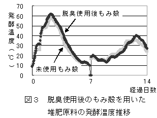 脱臭使用後もみ殻(水分約18%)を副資材とした鶏ふん堆肥原料(水分58%)の発酵温度は60度以上に上昇し、脱臭使用後もみ殻は副資材として再利用できる(図3)。 |