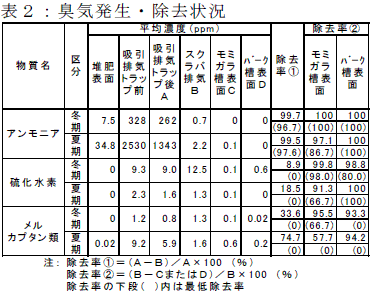アンモニア発生の多かった夏期で、堆肥表面アンモニア濃度は平均35ppm、吸引排気中は平均2530ppmで、最高では16000ppmに達した。リン酸23.5%水溶液250Lの循環によるスクラバ脱臭装置で平均1340ppmのアンモニアに対し97.6%以上除去でき、1ヶ月使用できた。後段の簡易吸着脱臭では、硫化水素についてはモミガラ・バークともに除去率が高かったが、メルカプタン類については両資材とも除去率が低い場合があった(表2)。 |