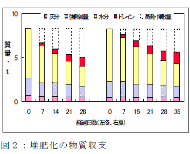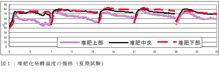 堆肥底部からの吸引通気(堆肥1m3当たり毎分通気量冬期51L・夏期42L)方式による堆肥化で、水分72.8%のふんも4週間後に水分が60.6%、有機物分解率が25%以上となり、堆肥化が進行した(表1、図2)。発酵温度は冬期・夏期とも70℃以上に上昇し、堆肥底部の吸引口付近が堆肥上部よりも高温で推移した(図1)。吸引口を2ヶ所のスポット方式としたところ目詰まりもなく通気できたが、堆肥底部から排出される部分に結露水とれき汁が混合したドレインが発生し、その量は初期堆肥重量の10%程度であった。堆肥中の窒素は、試験終了時26%減少し、ドレインに1.2~2.6%とリン酸スクラバ溶液に8.2~16.8%移行し、6.5~16.7%の行方は不明であった。 |
