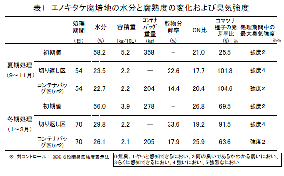 エノキタケ廃培地を乾燥するには、1m3のコンテナバッグに詰め込んで上部を開放し、風雨を避けて2ヶ月間静置すれば、従来の切り返し法と同様に乾燥し、切り返し法よりも臭気強度が低減される(表1)。 |
