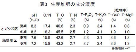 乾燥したエノキタケ廃培地を乳牛ふん尿に混合して水分を70~75%に調製し、コンテナバッグに充填・静置すれば、オガクズによる水分調整と同様に、夏期は4ヶ月、冬期は6ヶ月で切り返しせずに堆肥化できる(表2)。なお、中心部の最高温度は夏期が60℃弱、冬期が50℃程度である。また、廃培地を混合した堆肥の成分は、オガクズの場合と比較してP2O5とCaOの濃度が高い(表3)。 |