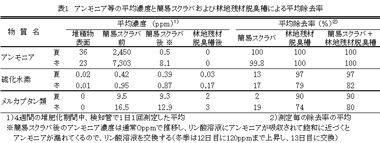 林地残材(スギ間伐材の枝葉等を粉砕したもの)を堆積した脱臭槽では、簡易スクラバで除去できない硫化水素を約90%、メルカプタン類を約80%除去できる。(表1)。 |