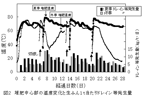 オガクズで水分調整した豚ふん(水分63%程度)は、圧送通気と同量(堆肥1m3当たり通気量0.03~0.1m3/分)の吸引通気で、堆肥中心部の温度が70℃以上に上昇し、夏季・冬季とも好気発酵が進む(図2)。 |