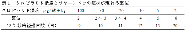 サヤエンドウを用いた生物検定(長野県中信農業試験場。ホルモン型除草剤残留の生物検定マニュアル)により、堆肥中のクロピラリドの有無、濃度の推定ができる(表1)。 |