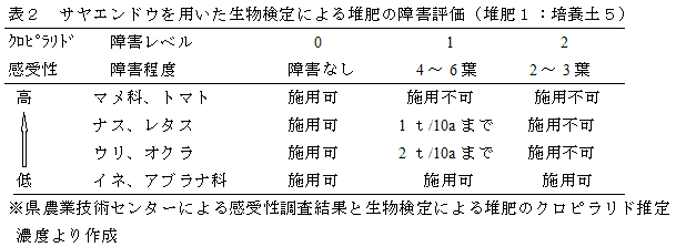 サヤエンドウを用いた生物検定(堆肥1:培養土5)によりクロピラリドの有無を確認し、障害程度より、作物のクロピラリドへの感受性に応じ、堆肥施用の可・不可、及び施用量の制限を実施し、作物への生育障害の未然防止を図る(表2)。 |