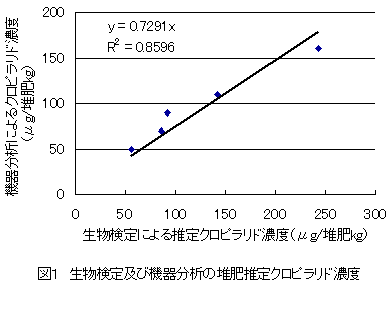 堆肥のクロピラリド推定濃度と機器分析(LC-MS法)によるクロピラリド分析結果には、高い相関関係が認められる(図1)。 |