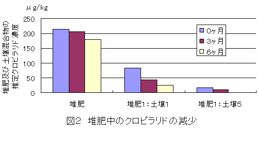 堆肥に含有するクロピラリドは、6カ月経過後でも当初の80%であるが、土壌と1:1で混合した場合は30%まで低下し、1:5で混合した場合は検出されなくなる(図2)。 |