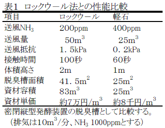 既存脱臭装置(ロックウ-ル方式)と比較すると、小規模で充填資材価格も安いため、装置全体でも低コスト化できる(表1)。 |