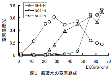 循環水には臭気のアンモニアおよびアンモニアが変化した硝酸が蓄積する。窒素が高濃度になるとアンモニアや亜硝酸濃度が高まるので、窒素濃度1%(電気伝導率40mS/cm程度)で循環水を引き抜き、堆肥に散布するか液肥利用する等で処分する(図3)。 |