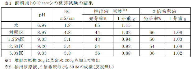 図1に示す60日間処理した堆肥ではBDF製造副生成物の添加水準に比例してEC、pHとも上昇したが、作物(飼料用トウモロコシ)発芽試験では2.5%添加までは発芽率に差はみられない。ただし、5%添加ではやや発芽阻害が見られる(表1)。 |