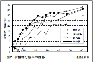 水分70%以下に調製した搾乳牛ふん尿の堆肥化時にBDF製造副生成物を5%程度添加することで、堆肥化初期の温度の立ち上がりが早くかつ高くなり(図1)水分蒸散が促進されて、堆肥の乾物割合が高くなるとともに堆肥化の一次発酵期間が短縮される。 |