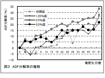 灰分含量から推定した有機物の分解率は添加区が5~15%高く推移し、堆肥化初期からBDF製造副生成物由来有機物の分解が促進される(図2)。また、堆肥中のADF分解率で見ると堆肥化初期においてふん由来の繊維成分の分解も促進される(図3)。 |