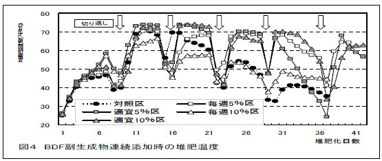 BDF製造副生成物を家畜ふん堆肥(牛ふん主体)に連続的(毎週区と隔週区でそれぞれ5%と10%を添加)に混合して分解処理する場合は、堆肥化物の5%重量以内で適宜水分補充(堆肥化物の水分を40~45%に維持)をしていけば、毎週添加しても発酵が継続され、副生成物中のグリセリンや脂肪は分解される(図4)。 |