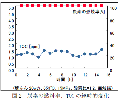 含水率80wt%に調整した豚ふんを0.6L/hourの速度により注入し、温度653℃、圧力15MPa、酸素供給比1.2、無触媒条件にて15時間の燃焼試験を実施した。その結果、燃焼後の廃液のTOC(全有機炭素量)は2.0ppm以下で、炭素の燃焼率はほぼ100%である。(図2) |