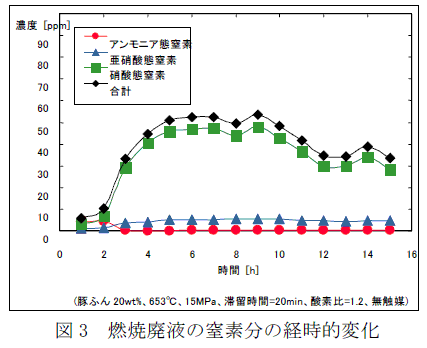投入豚ふんのほとんどの窒素分は気化し、15時間燃焼試験時の廃水中の窒素分濃度は60ppm以下で、燃焼15時間めには40ppm以下まで低下する。(図3) |