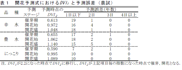 開花日は、2つの発育ステージを表す式(自発休眠期:DVI1 =ΣDVR1 、DVI1は自発休眠期の発育ステージ、DVR1は自発休眠期の発育速度、他発休眠期:DVI2 =ΣDVR2 、DVI2は他発休眠期の発育ステージ、DVR2は他発休眠期の発育速度)により予測できる(表1)。 |