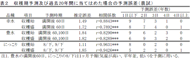 収穫期の予測は、 y=ax1+bx2+c(x1:満開後の平均気温、x2:収穫前の平均気温) の重回帰式で示され、「幸水」、「豊水」では満開日から38日間、「にっこり」は42日間の平均気温により予測でき、収穫予定日前(豊水:収穫始70~41日前、にっこり:満開後141~160日)の平均気温を加えることでさらに精度は高まる(表2)。 |