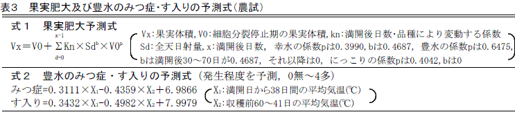果実肥大は、細胞分裂停止期の果実体積と予測日以降の全天日射量を使用することで予測が可能で、式1により果実体積を予測でき、しかも猛暑および冷夏の年にも精度が高い(表3)。 |