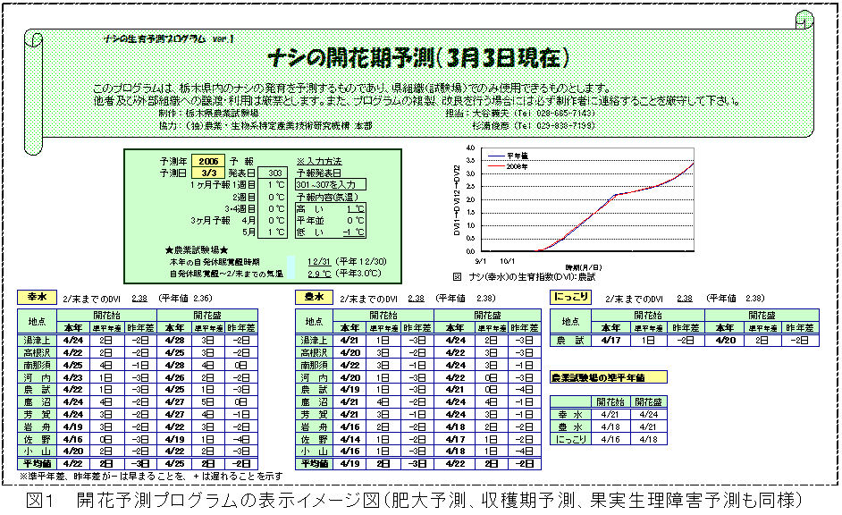 生育予測プログラム(図1)は本県の生育診断ほ10カ所において、過去10年間(農試は20年間)の生育状況と気象データ(アメダス値)により作成し、予測日までのアメダスデータ(開花期は9月1日以降の毎時の気温、収穫期は満開日以降の毎日の平均気温、果実肥大は予測日以降の全天日射量および日照時間、果実生理障害は満開日以降の毎日の平均気温)および気象予報(1か月、3か月予報)を代入することで、ニホンナシの生育を予測できるプログラムである。 |