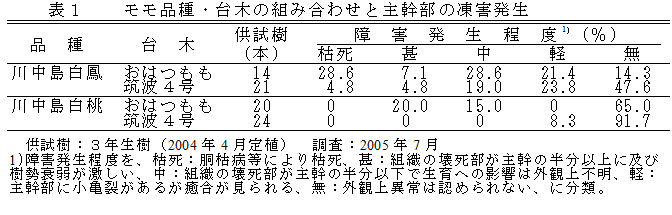 凍害発生は、品種と台木の組み合わせにより程度が異なり、品種では「川中島白桃」に比べ「川中島白鳳」で障害発生率も高く程度も大きくなる。 台木では「筑波4号」に比べ「おはつもも」で、障害発生率も高く程度も大きい。特に、「川中島白鳳」と「おはつもも」の組み合わせにより障害発生が助長される(表1)。 |