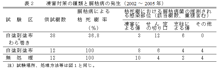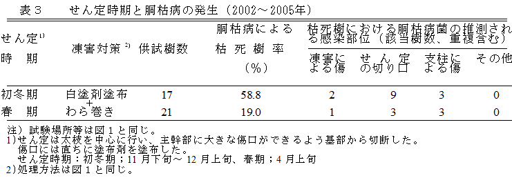 胴枯病の感染は、凍害による傷やせん定の切り口に由来することが多い(表2)。 |