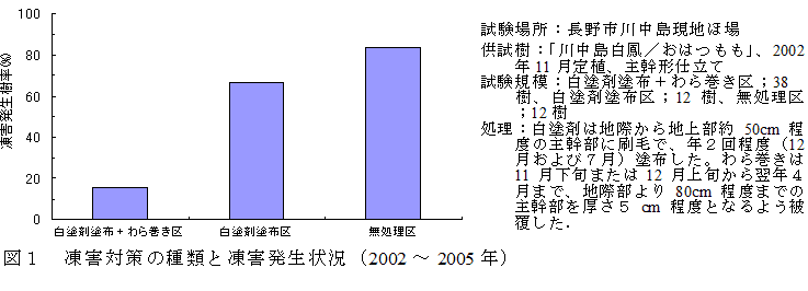 凍害防止対策としては、主幹部に白塗剤を塗布しただけでは十分な防止効果は得られないが、あわせてわら巻きを行うと効果が高い(図1)。 |