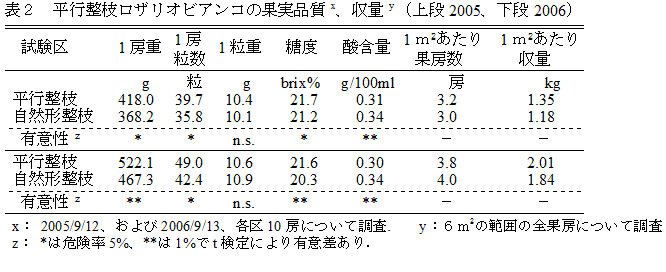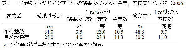 「ロザリオビアンコ」は発芽率が低く着花が悪いため、せん定時に多めの芽数を残し、着花・着粒が確認されるまで多くの新梢が残される。また樹勢が強く新梢は長いため、新梢管理には多大な労力を要する。平行整枝の導入により作業労力軽減が期待できるが、短梢剪定では不発芽により新梢が確保できず、これにより翌年の結果母枝も欠落することから、長梢せん定と組み合わせた平行整枝を開発する。 | ||||||||||