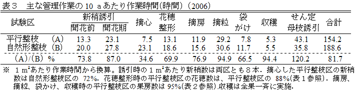 「ロザリオビアンコ」栽培において、2m間隔の平行な直線上に長梢せん定した結果母枝を誘引する。この結果母枝の列1mの間に16本の新梢を配置し7から8房を着果させることで、自然形整枝より18%少ない作業時間で同等の収量、果実品質が確保できる。 | ||||||||||
