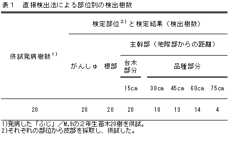 発病樹20樹の検定結果は全樹から病原菌が検出され、検出漏れはない(表1)。 |