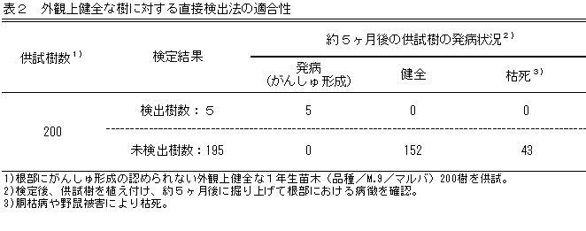 本法で検定した外観上健全な200樹のうち、病原菌が検出された5樹は新たに無菌土壌に植え付けて行った5ヶ月後の発病調査で、根部にがんしゅを形成して発病が認められる。病原菌が検出されなかった195樹は、他の原因で枯死した樹を除き、全て発病は認められない(表2)。 |