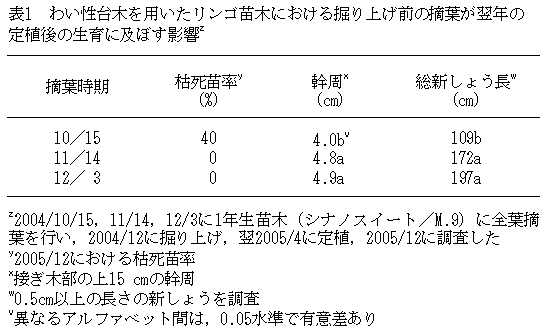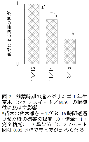 [キーワード]リンゴ、苗木、わい性台木、摘葉、耐凍性 |