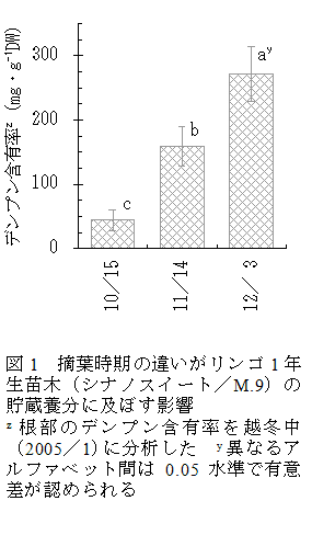 わい性台木M.9を用いたリンゴの苗木育成において、掘り上げ前の摘葉時期が早いと台木の貯蔵養分が減少し、耐凍性が低下する。また、定植後の生育も劣る。定植後の生育への影響が少ない摘葉時期は11月中旬以降である。 | ||||
