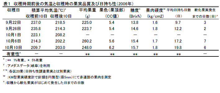 収穫10日前の積算平均気温が230℃以上あると日持ち日数が10日前後となり、軟化果実発生までの日数が2~3日と短い。一方、積算平均気温が220℃以下になるといずれの日数も長くなる(表1)。 |