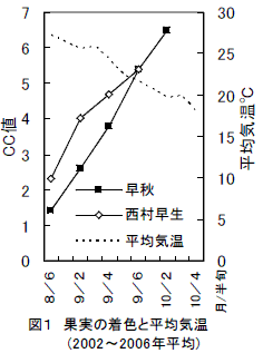 「早秋」は、「西村早生」と比較して、着色開始期がやや遅いが、9月下旬から急激に着色が進む(図1)。 |