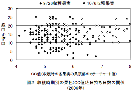 収穫時期の果色と日持ち日数には相関関係が認められず、果色が進んだ果実でも日持ち日数に15日前後の差がある(図2)。 |
