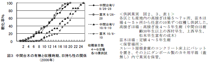 中間台木の有無による日持ち性の差は、10月上旬収穫で軟化率の進捗状況に差が認められるが、軟果発生までの日数には差が無く、その影響は小さい(図3)。 |
