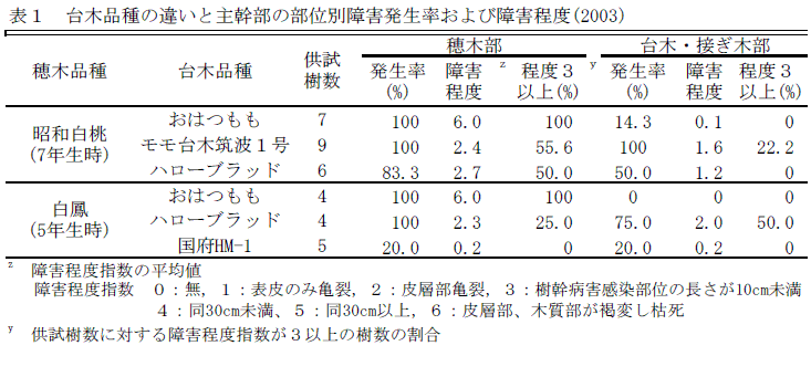 慣行台木品種の「おはつもも」は、主幹部障害の発生率、枯死率が高い。主幹部障害の発生部位は、台木・接ぎ木部より穂木部に多く、障害程度が高い(表1、表2)。 |